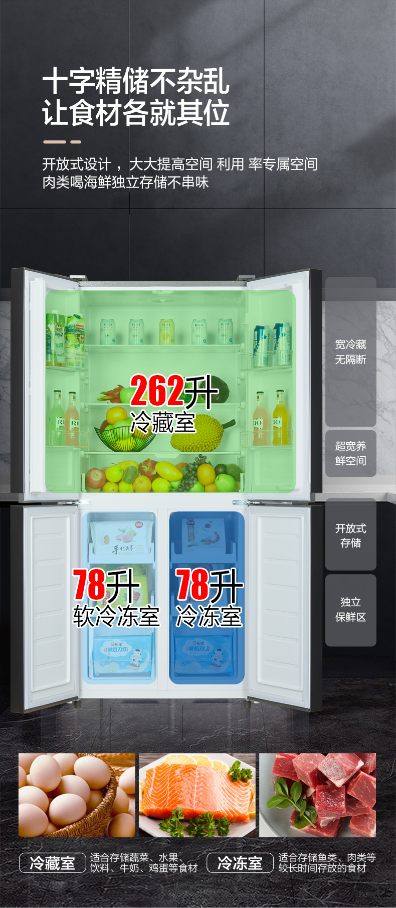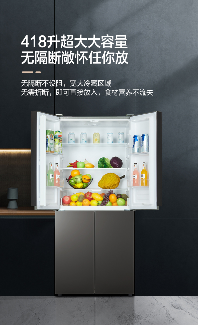 产品描述:韩电418升十字匀冷冰箱凭借其温度均匀、节能环保、大容量储存、智能控制、静音运行以及易清洁维护等卖点,成为了现代家庭的首选之一。