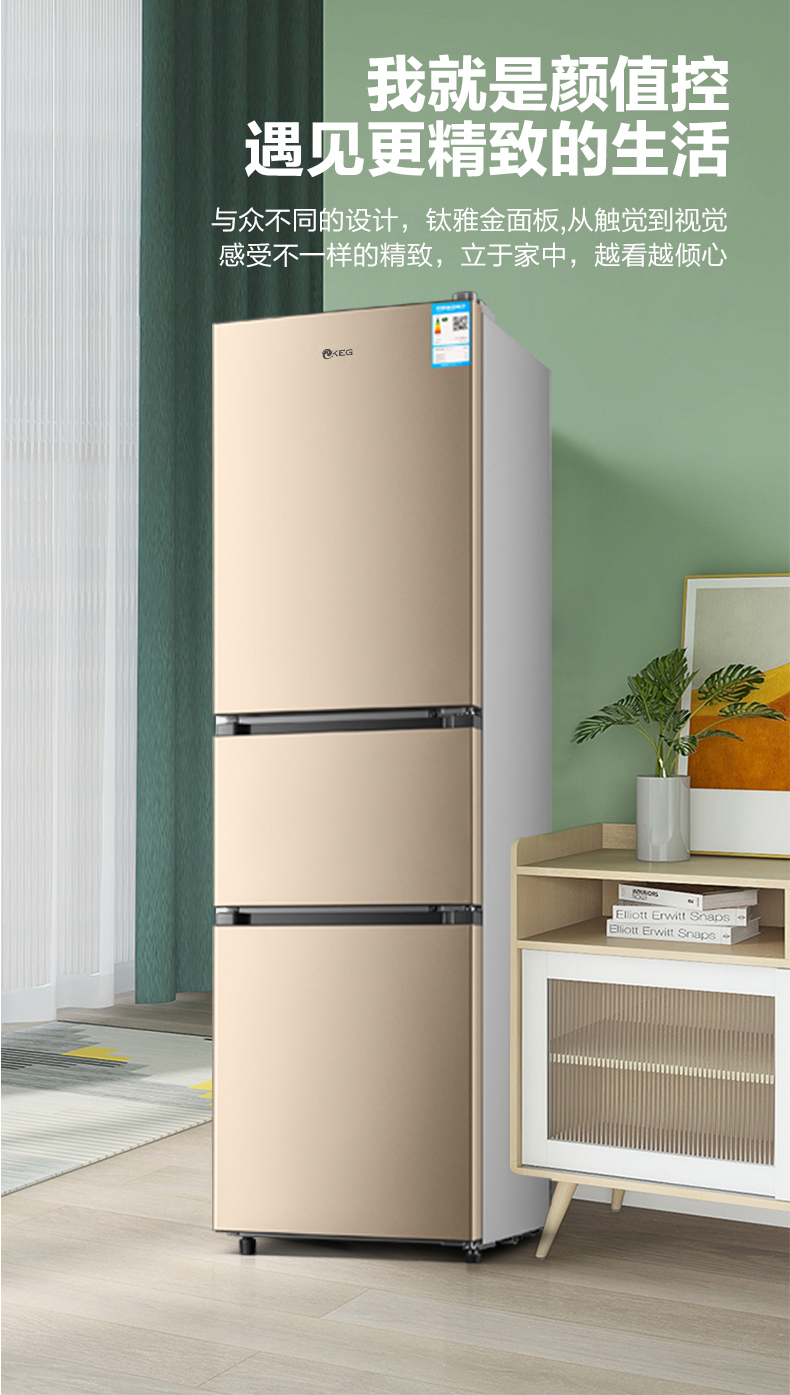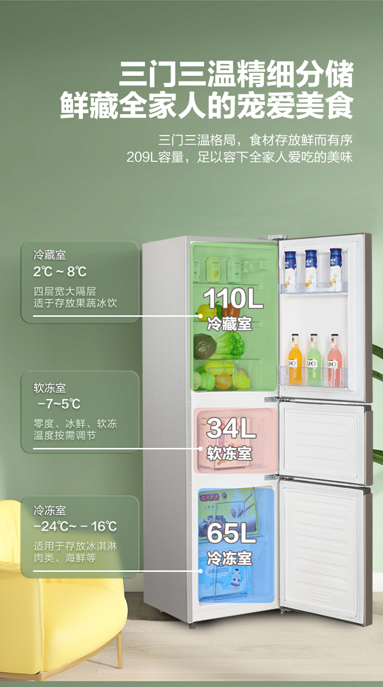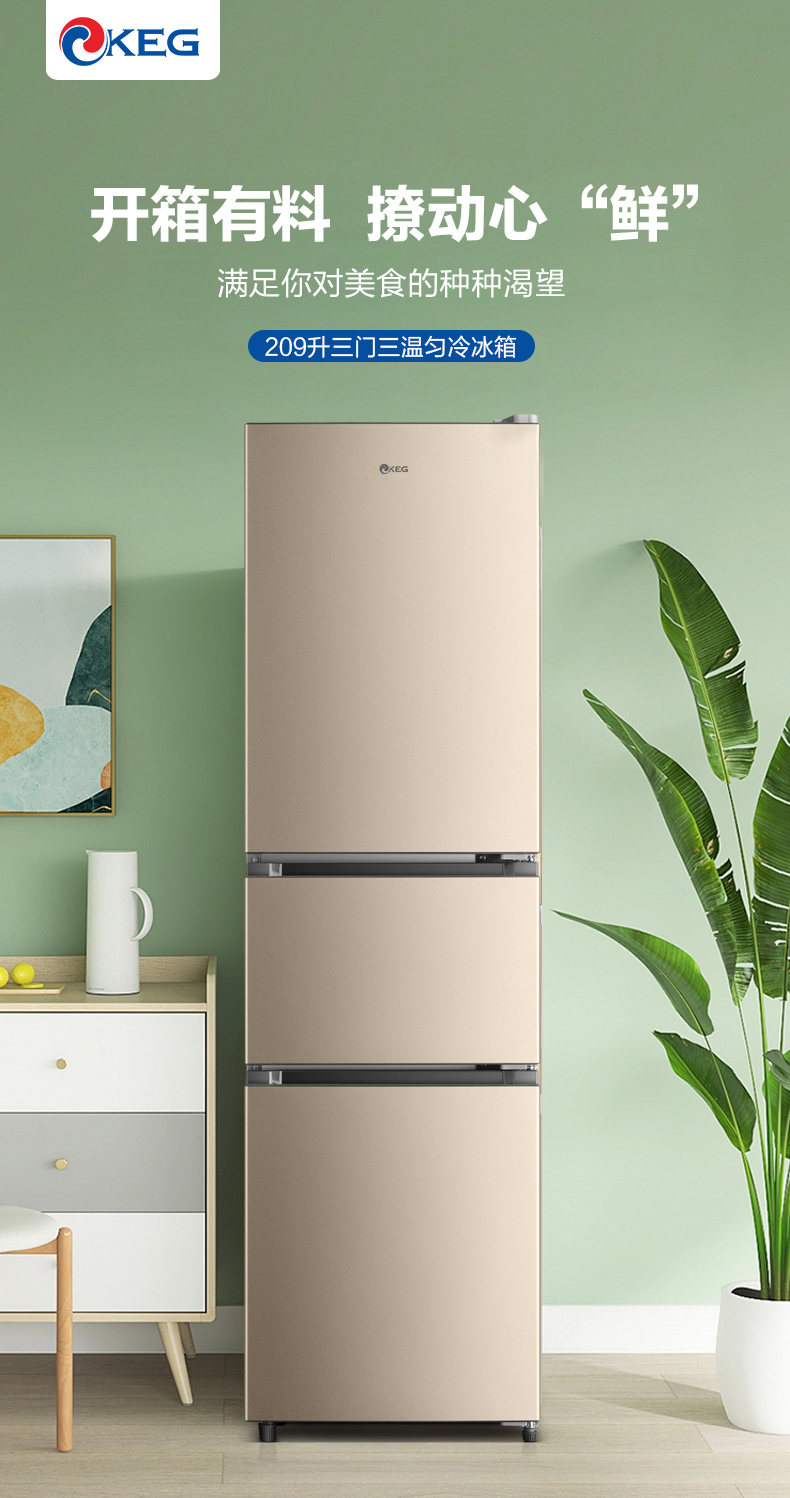 产品描述:韩电209升三门三温匀冷冰箱以其三门三温设计、匀冷技术、节能环保、智能控制、大容量设计和时尚外观等特点,成为现代家庭理想的冰箱选择。