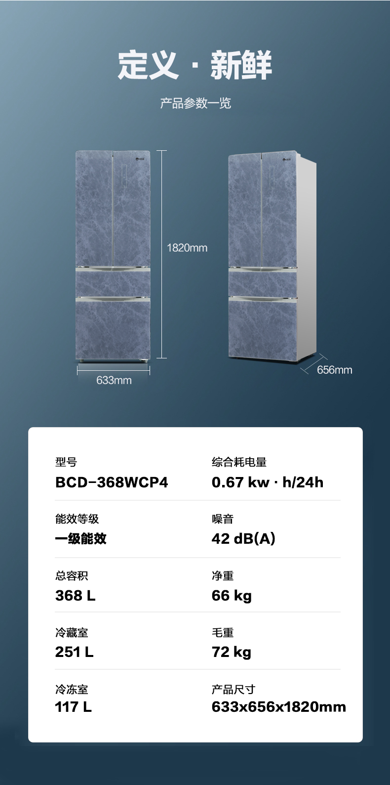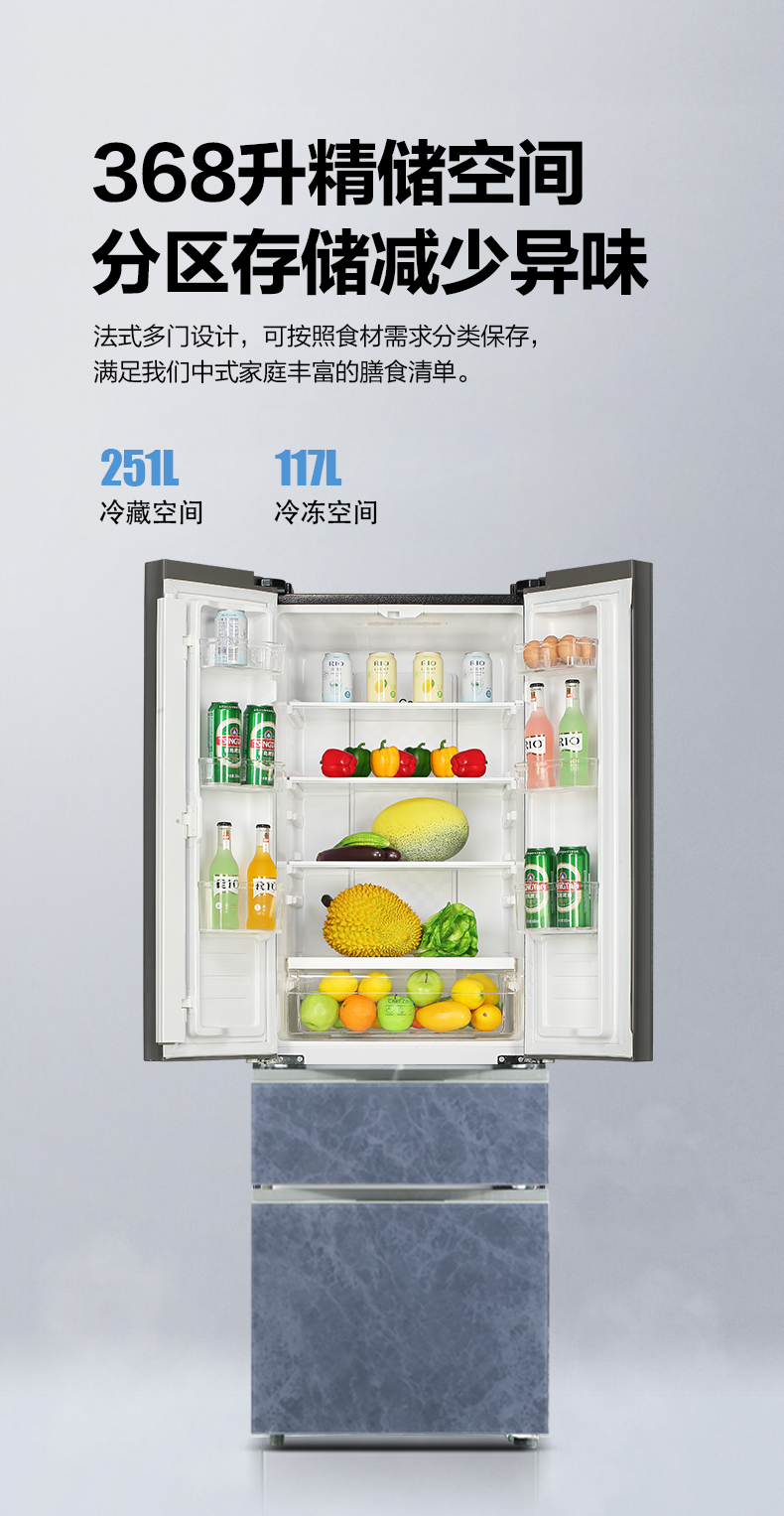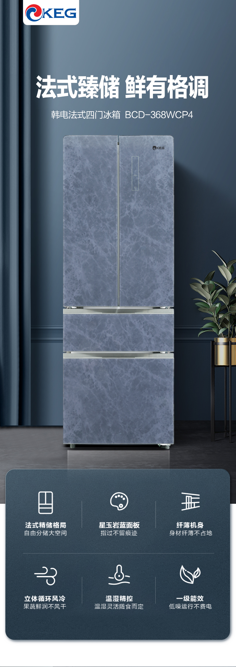 产品描述:韩电368升法式多门风冷冰箱,凭借其独特的设计、先进的技术和无可挑剔的性能,为追求优雅与智能生活的您带来前所未有的体验。