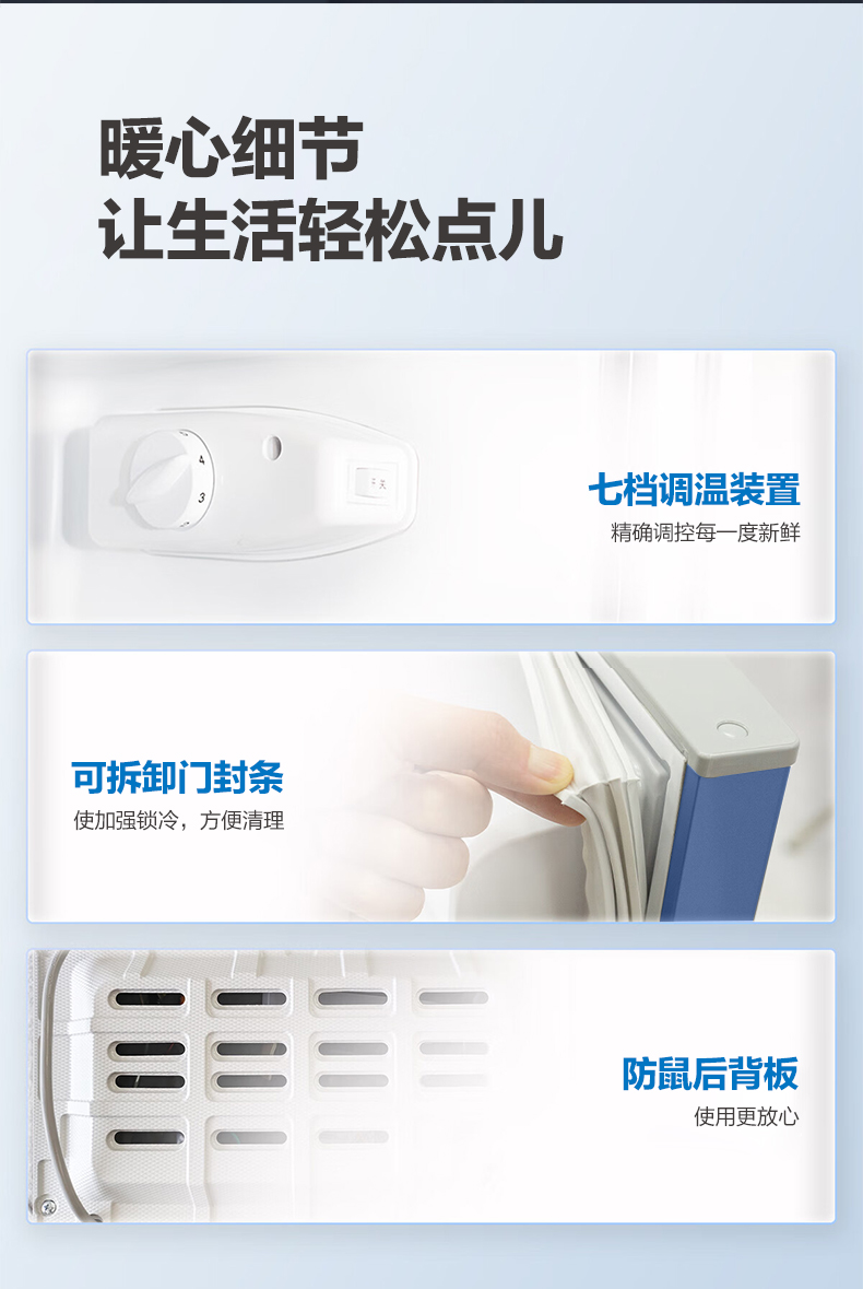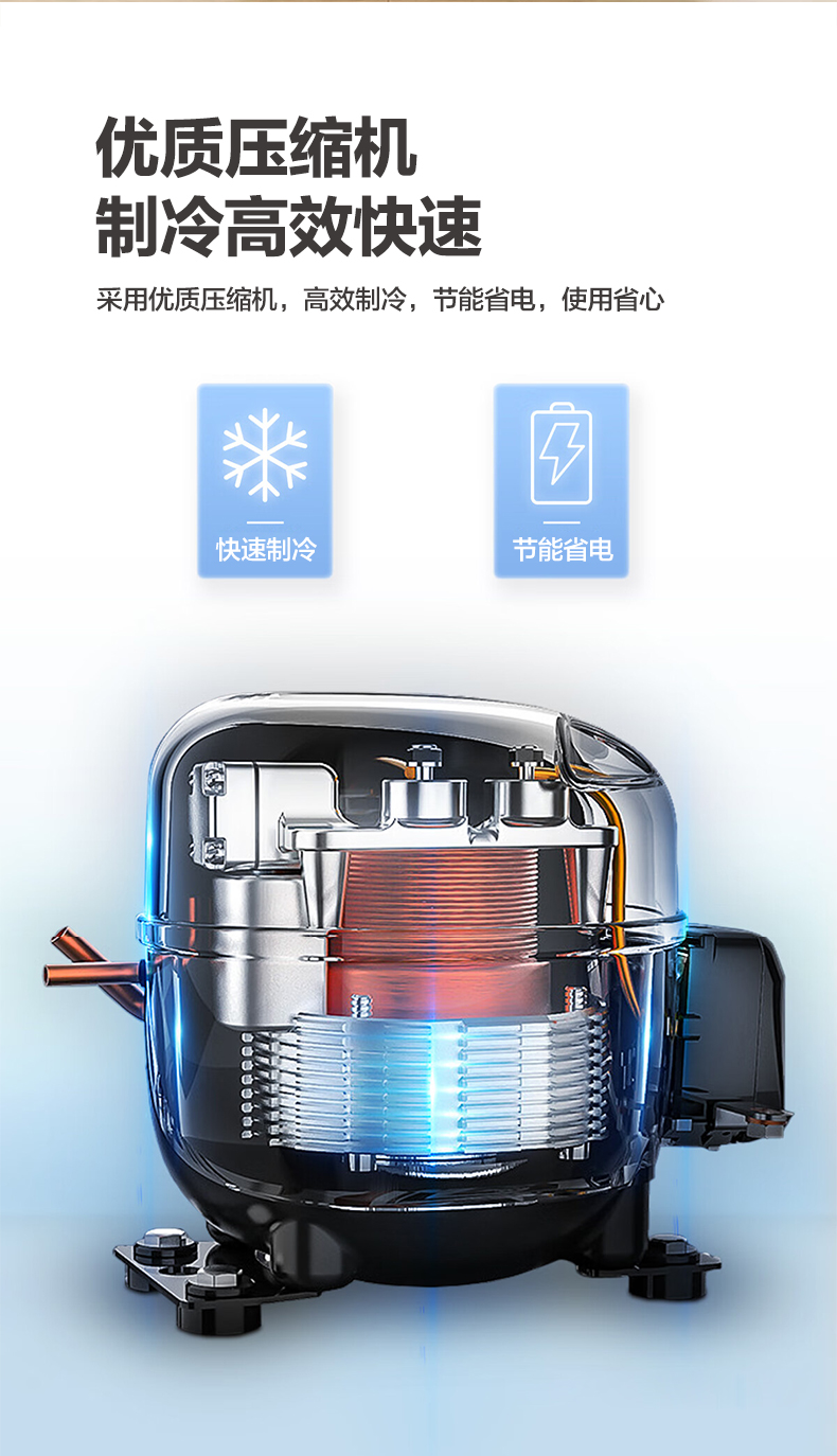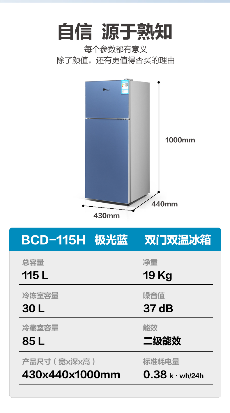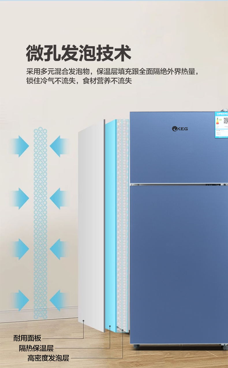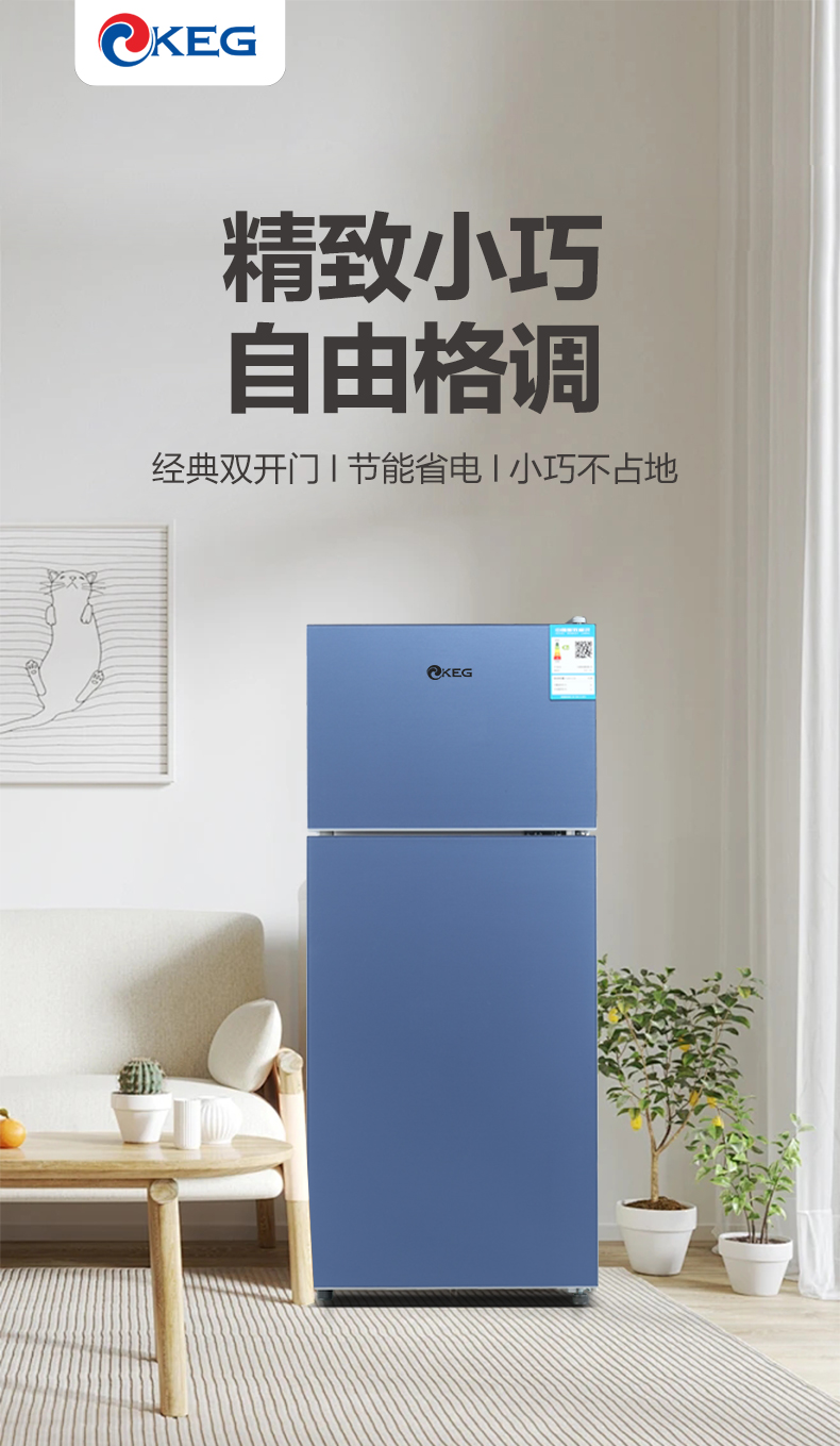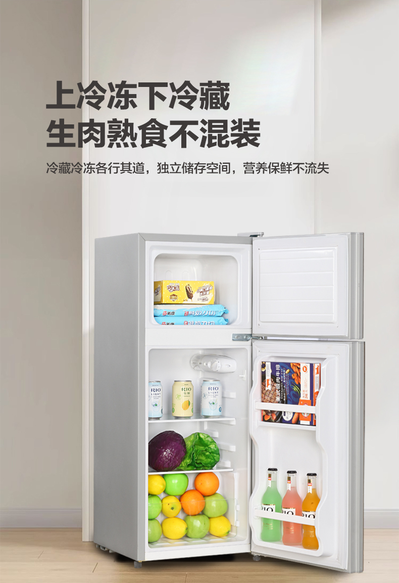 产品描述:这款115升双门直冷小冰箱。以其优雅的设计、卓越的性能和实用的功能,成为现代家庭的理想选择。