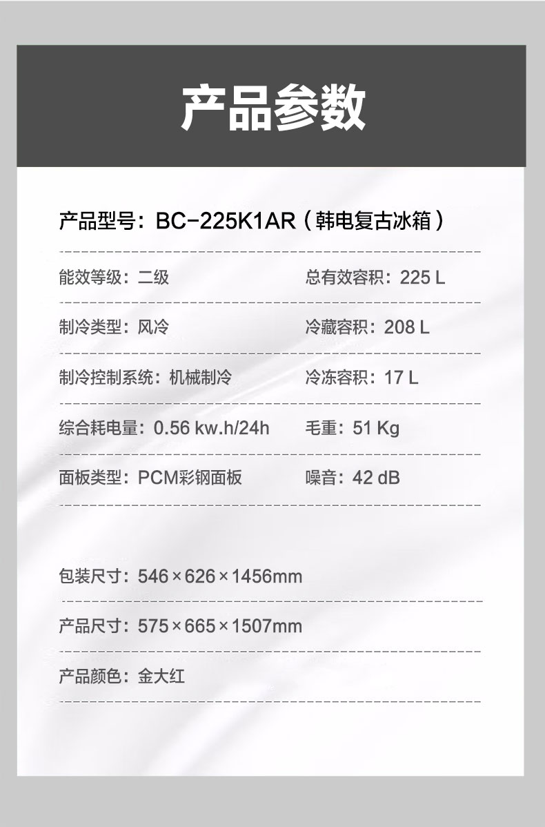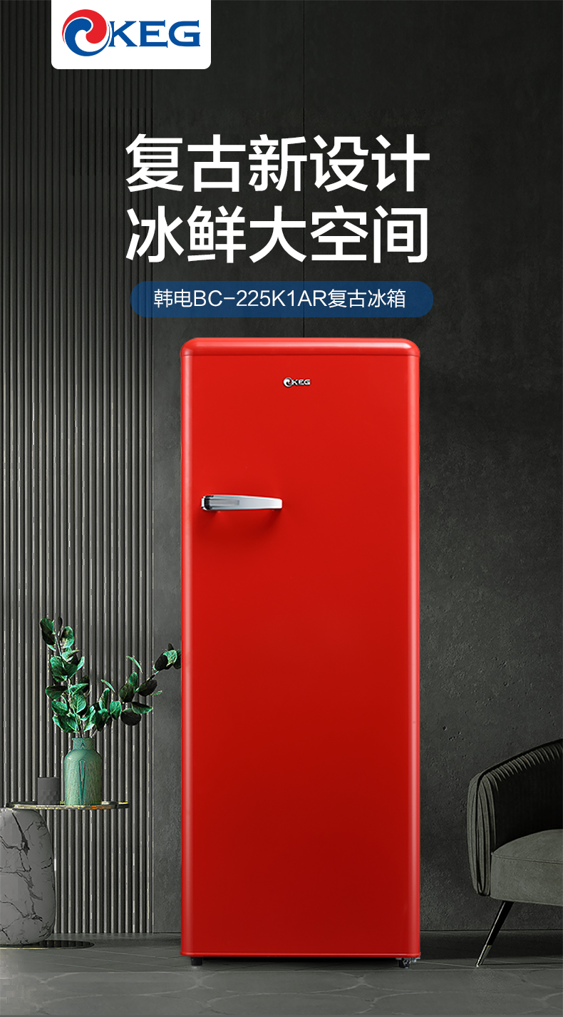 产品描述:韩电225升单门双温复古冰箱,以其独特的设计和卓越的性能,采用了先进的压缩技术和优质的绝热材料,能有效减少冷气的流失,降低能耗。同时,其静音设计,让您在使用过程中不···