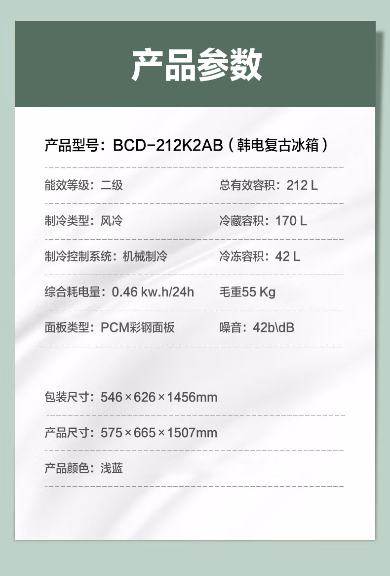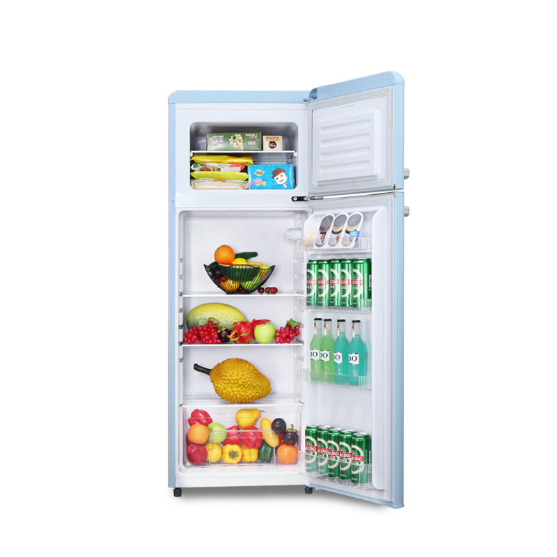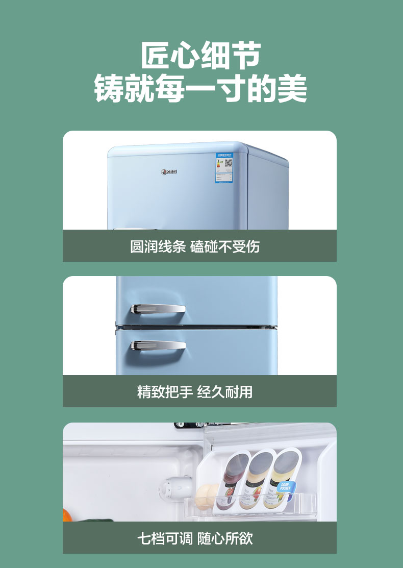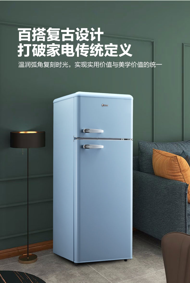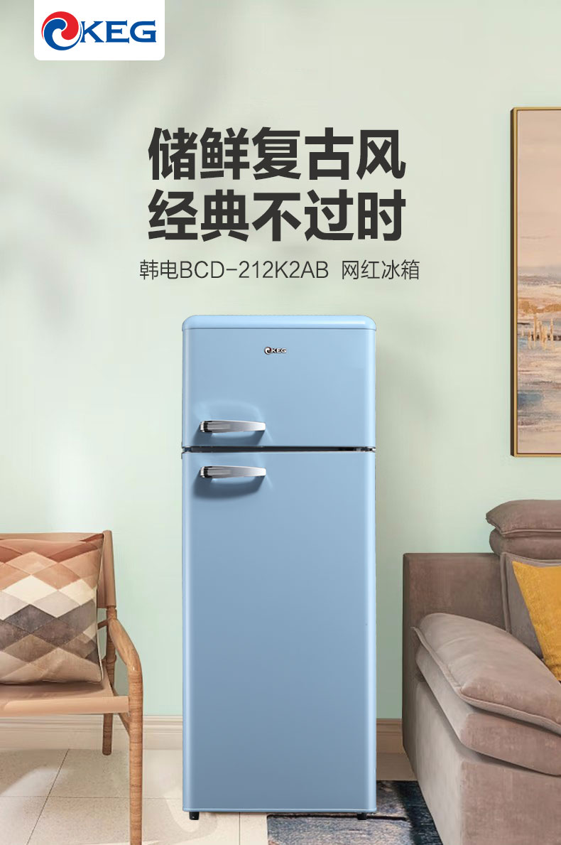 产品描述:韩电212升双门复古冰箱,结合复古设计与现代功能,为厨房增添优雅浪漫,满足多功能需求。
