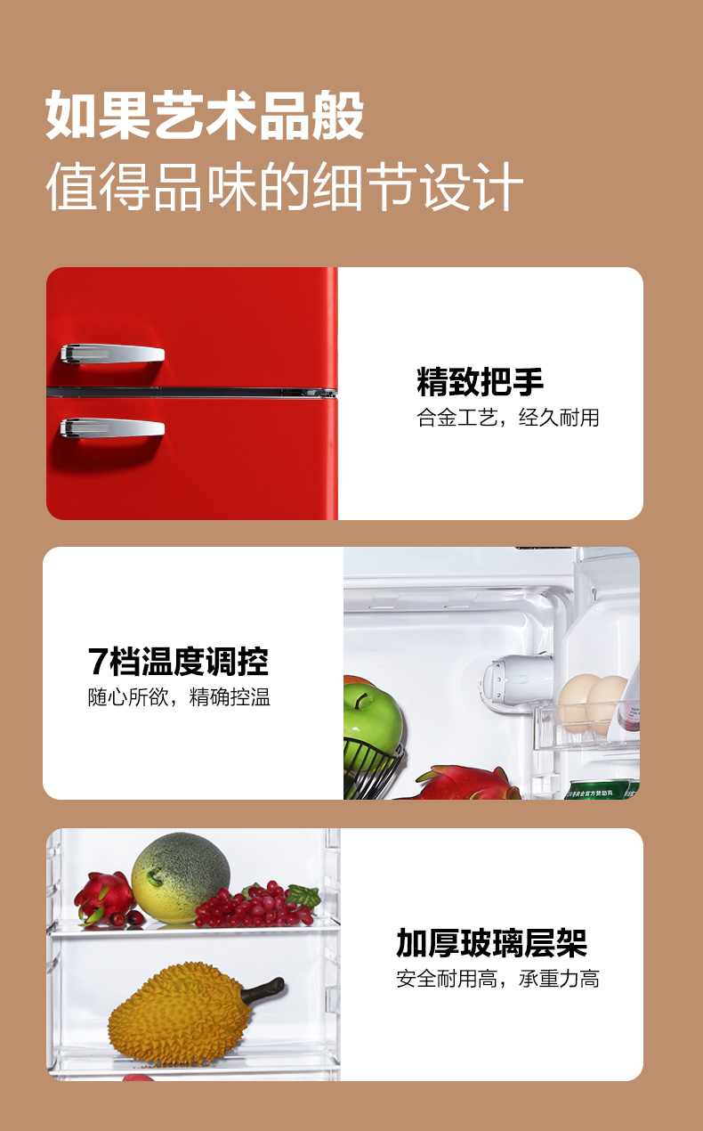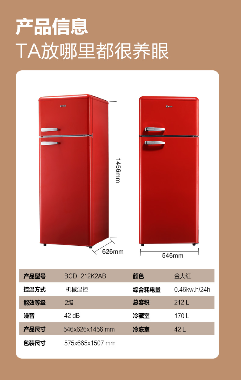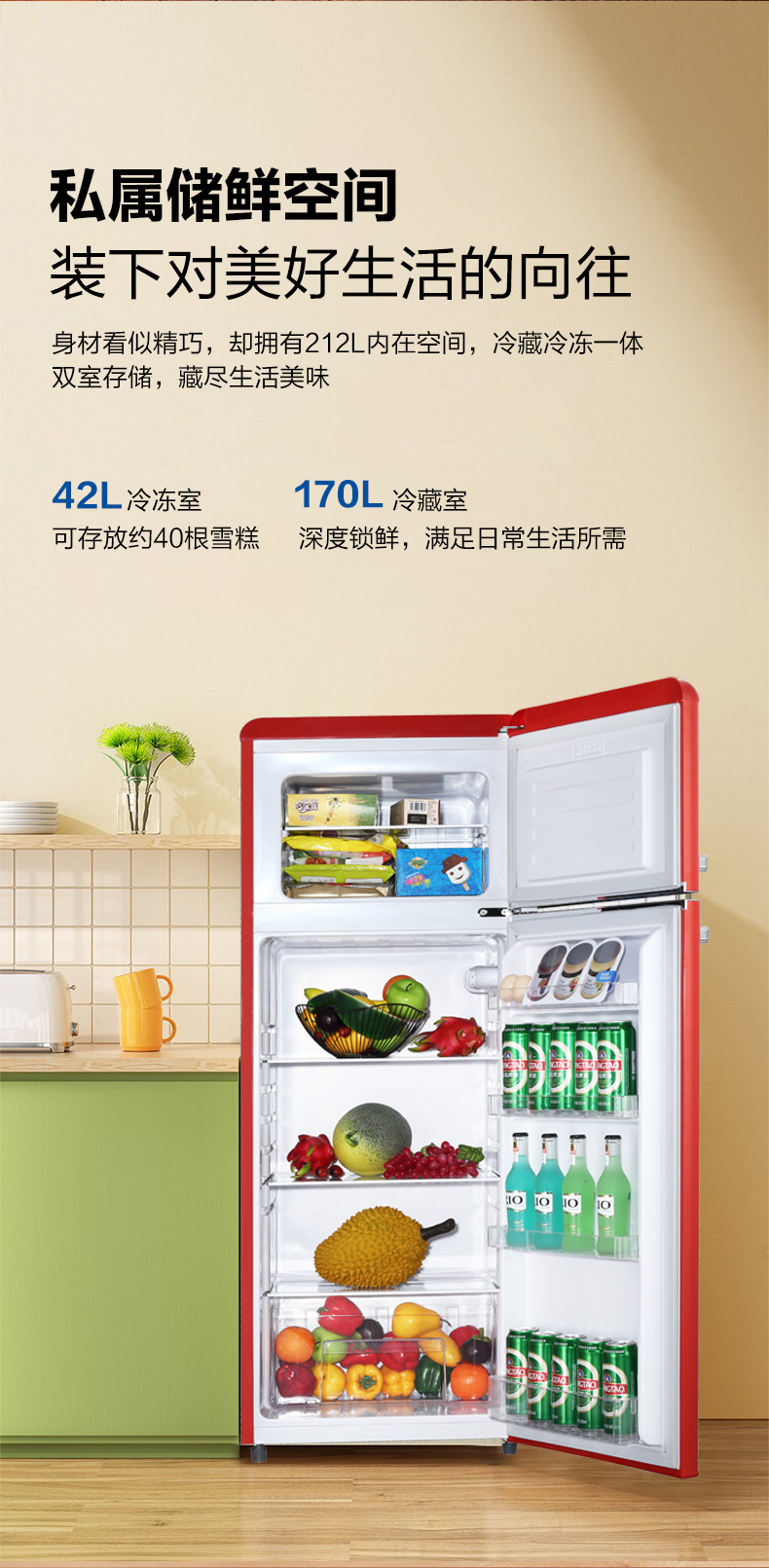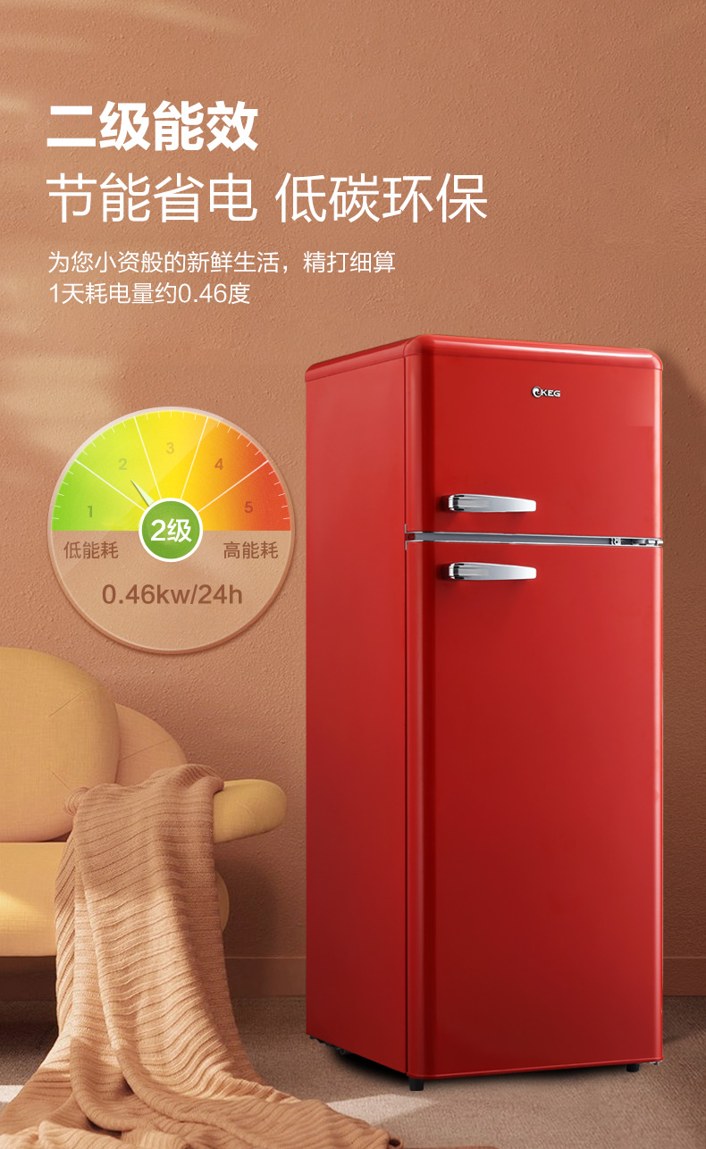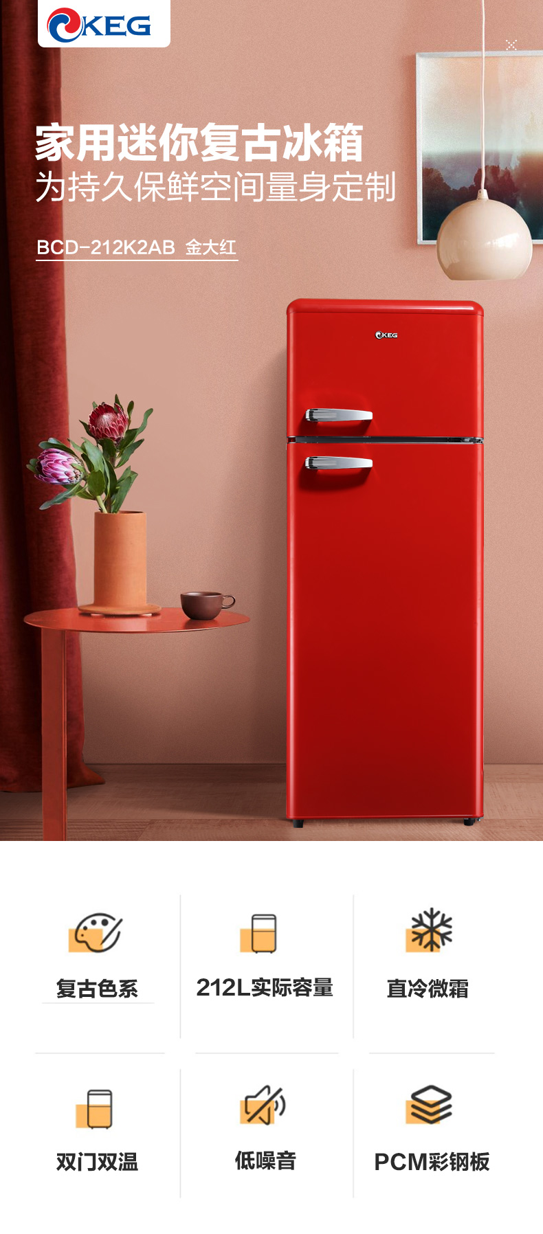产品描述:韩电212升双门复古冰箱,结合复古设计与现代功能,为厨房增添优雅浪漫,满足多功能需求。