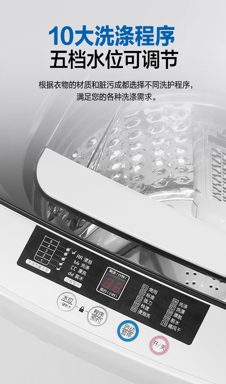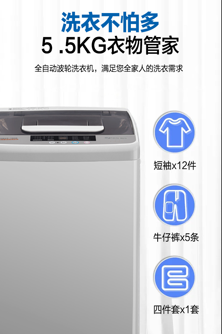 产品描述:韩电5.5 公斤全自动洗衣机,以适中容量、便捷操作、多样模式、节能静音等诸多优点,为您带来贴心高效的洗衣体验。