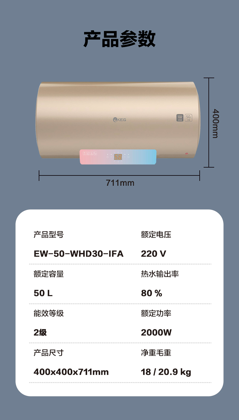 产品描述:韩电50升热水器拥有快速加热功能,让您无需漫长等待即可享受热水;精准控温技术,确保水温稳定舒适;大容量设计满足全家用水需求;高效节能,为您节省电费开支;安全防护系···
