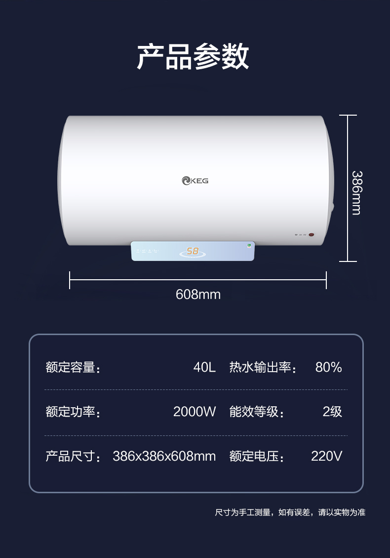 产品描述:韩电40升热水器拥有快速加热功能,让您无需漫长等待即可享受热水;精准控温技术,确保水温稳定舒适;大容量设计满足全家用水需求;高效节能,为您节省电费开支;安全防护系···