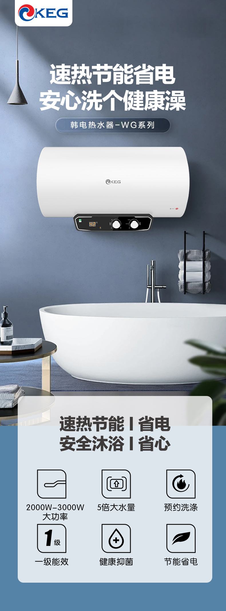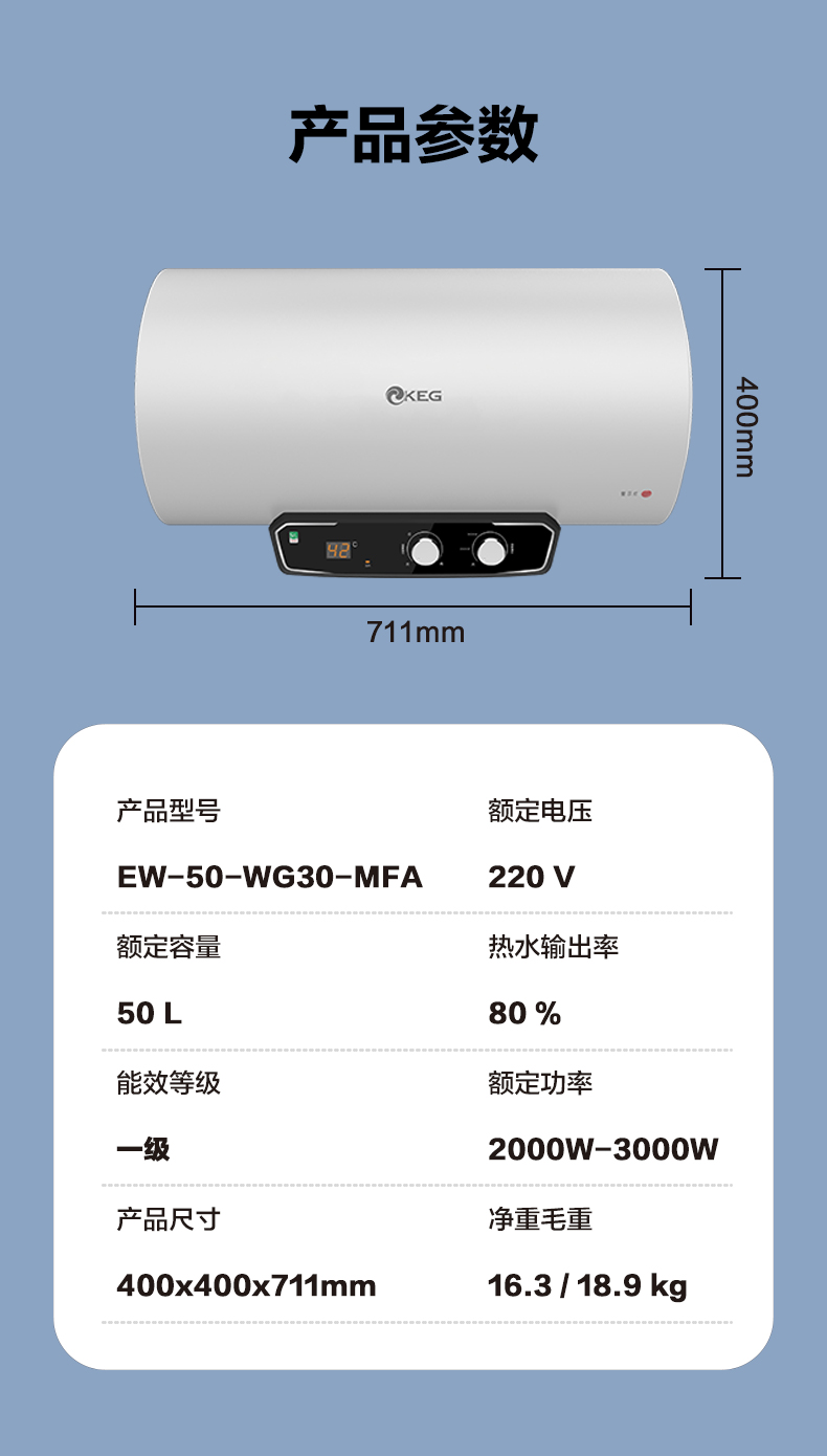 产品描述:韩电50升热水器拥有快速加热功能,让您无需漫长等待即可享受热水;精准控温技术,确保水温稳定舒适;大容量设计满足全家用水需求;高效节能,为您节省电费开支;安全防护系···