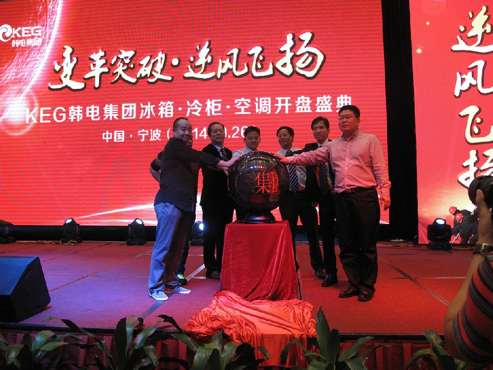 2014年10月26日,“变革突破、逆风飞扬”韩电集团2015年度冰箱、空调、冷柜开盘盛会在杭州湾世纪金源大饭店隆重举行。本次大会规模空前,出席会议的有集团董事长沈东平,集团总裁沈凯峰,冰箱、冷柜、空调三军负责人及各位奋战在各路前线的销售、售后、后勤等“机要人员”,共计千余人。