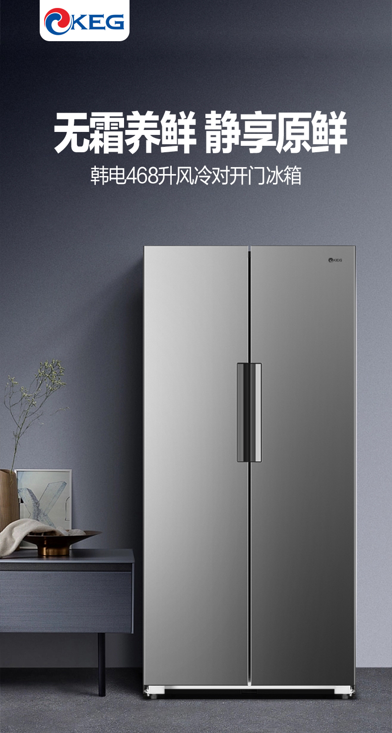 产品描述:韩电468升对开门字风冷冰箱凭借其双对开门设计、风冷无霜技术、大容量储存空间、节能环保、智能控制、静音运行以及时尚外观设计等卖点,成为了现代家庭理想的食品储存设备。···