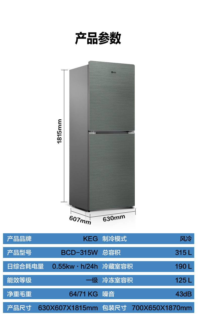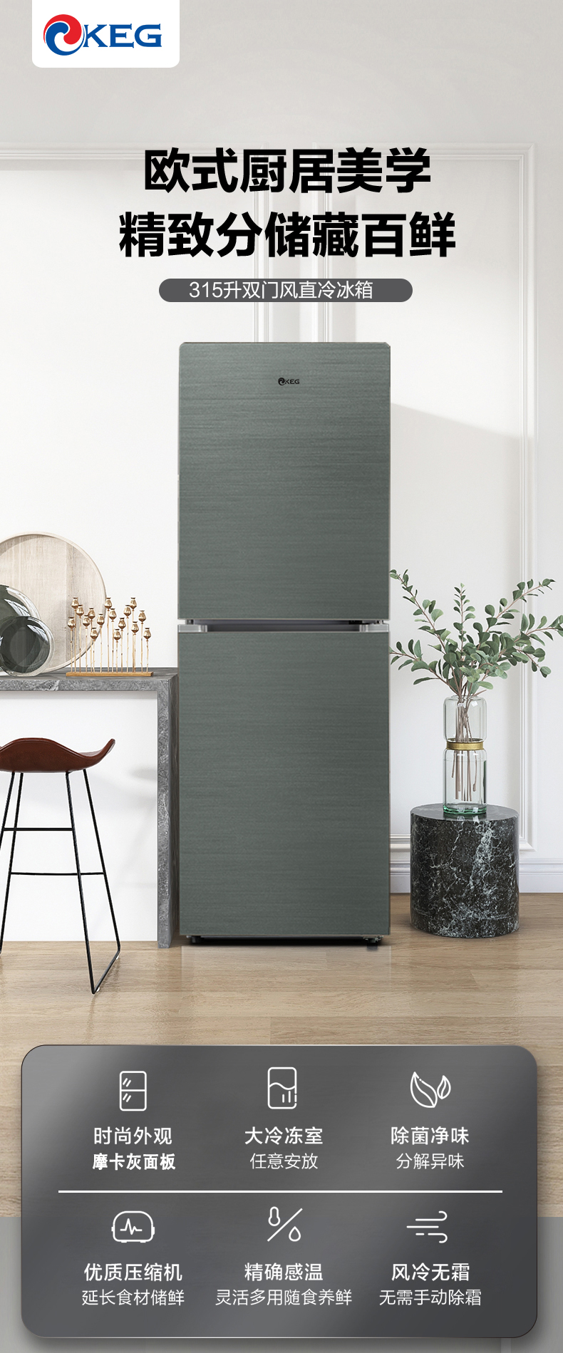 产品描述:韩电315升双门风直冷冰箱凭借其高效制冷、节能环保、超大容积、智能控制、静音运行、防串味设计、易清洁维护和时尚外观设计,可以与各种家居风格完美融合。