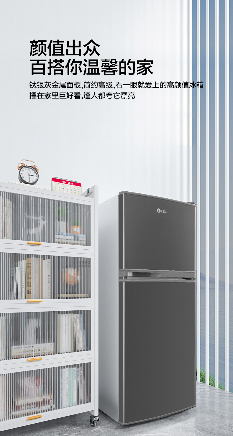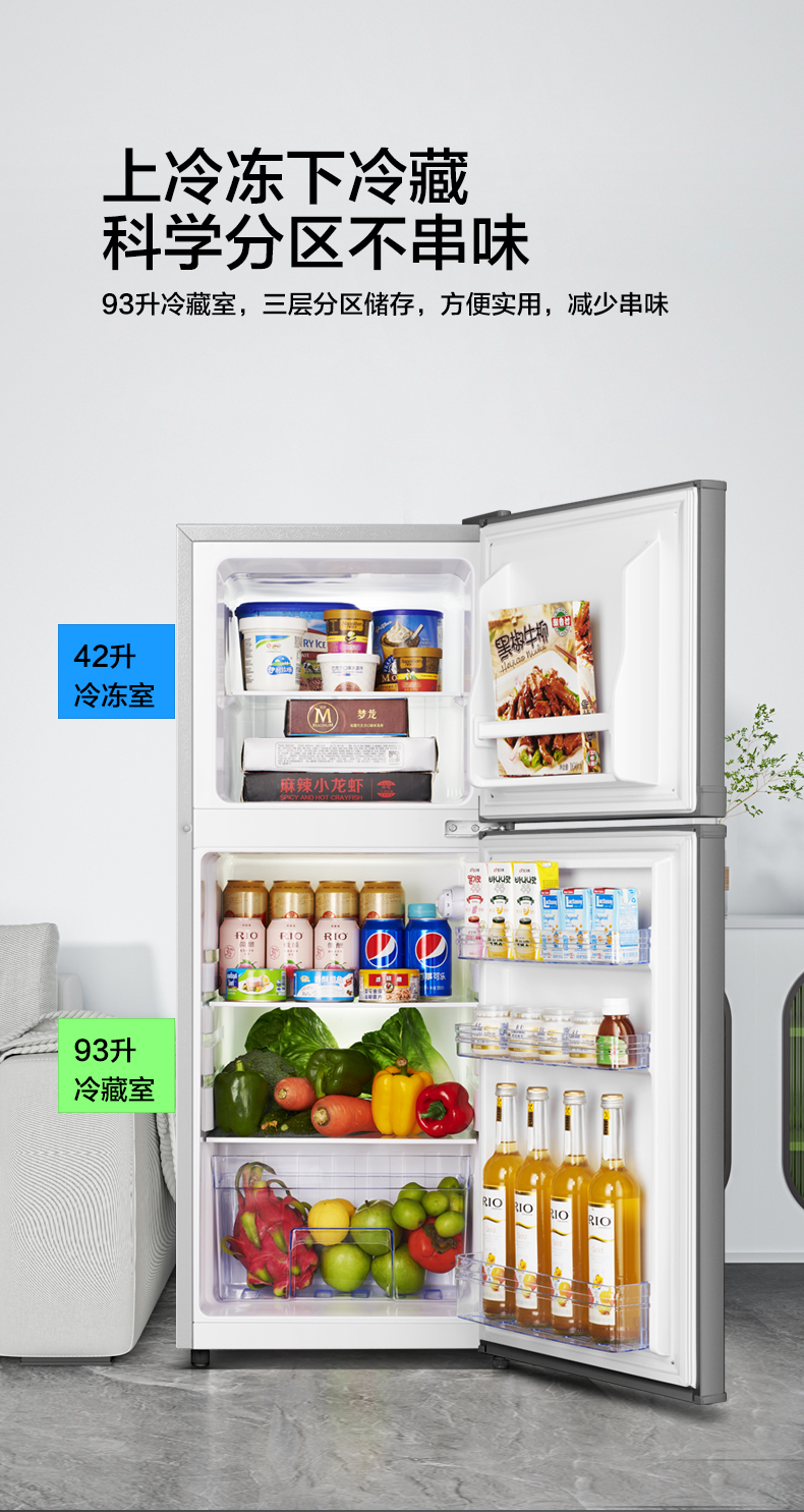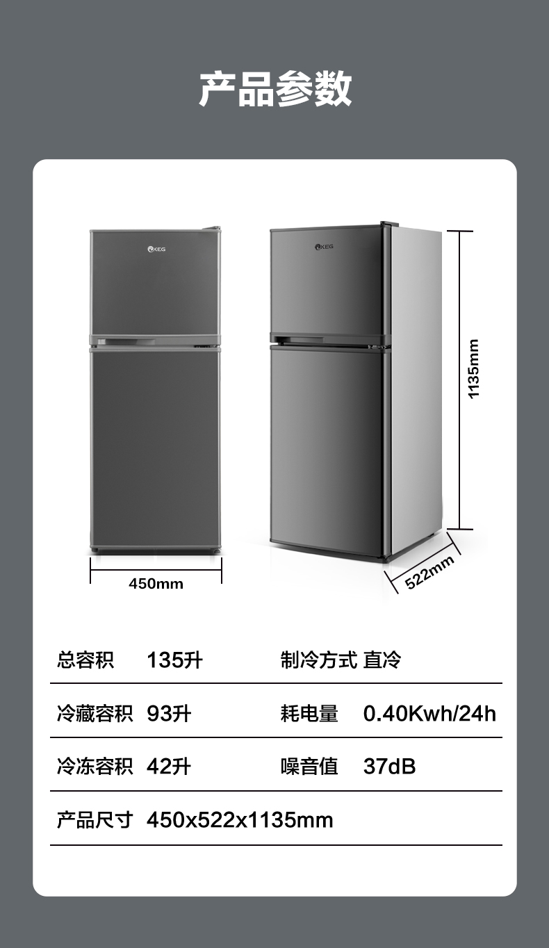 产品描述:这款135升双门直冷小冰箱。以其优雅的设计、卓越的性能和实用的功能,成为现代家庭的理想选择。