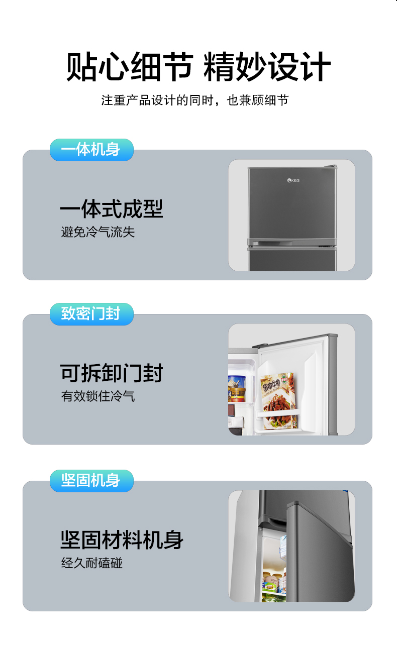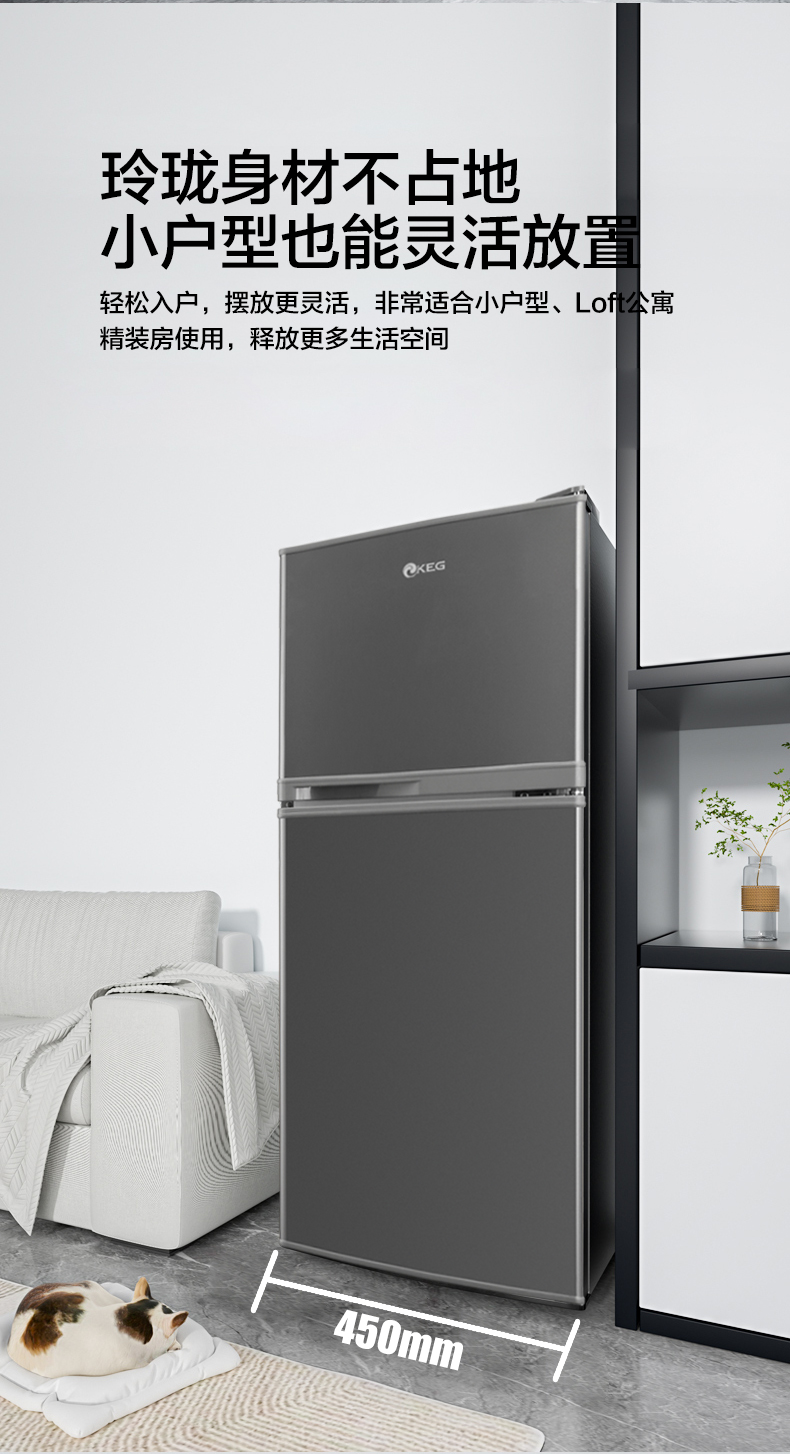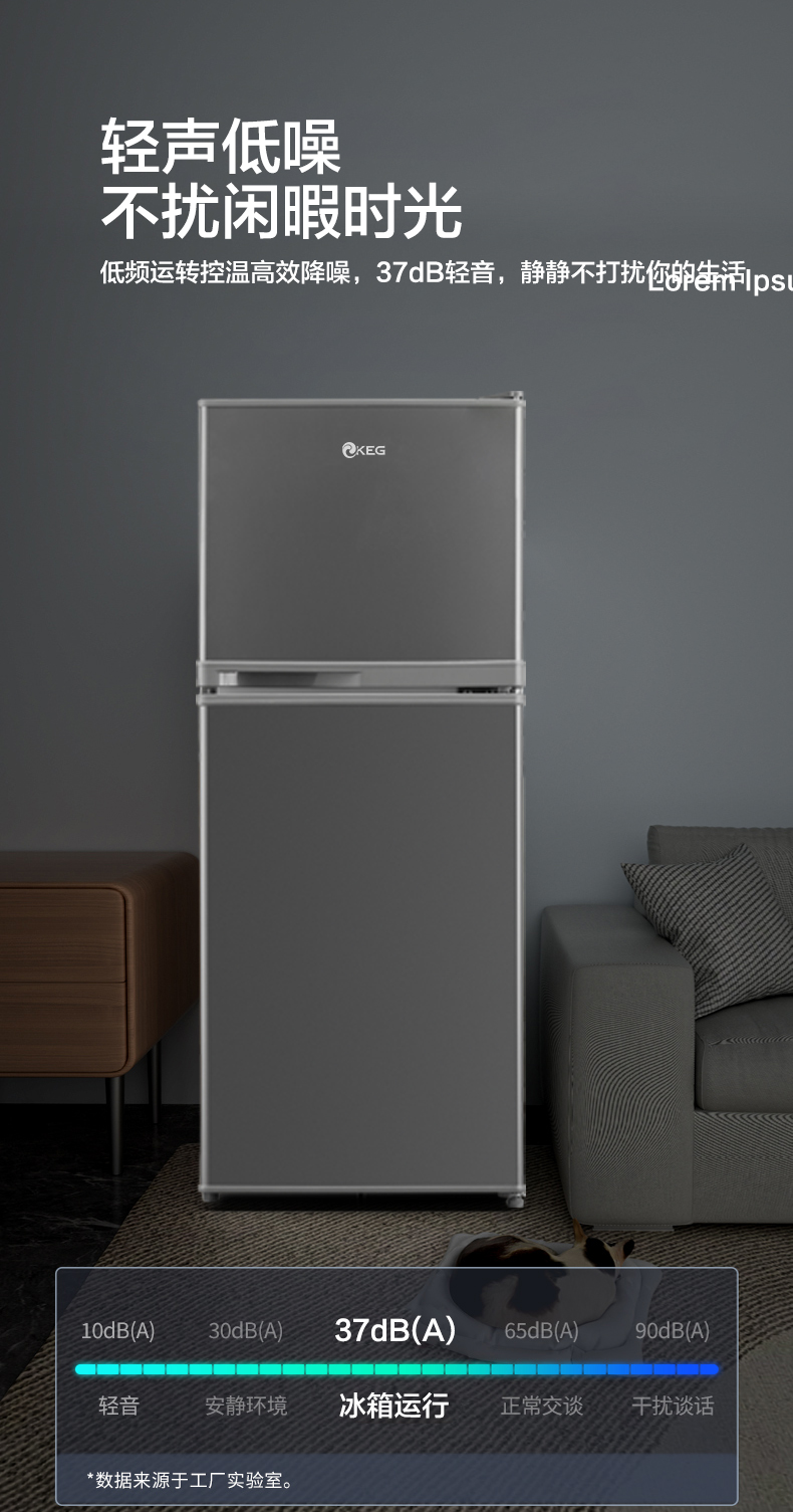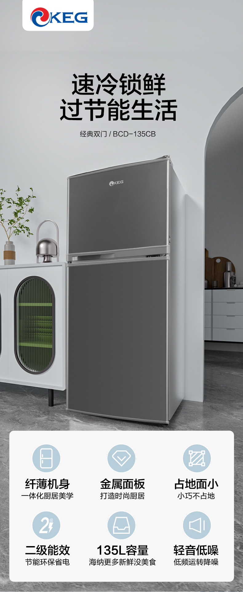 产品描述:这款135升双门直冷小冰箱。以其优雅的设计、卓越的性能和实用的功能,成为现代家庭的理想选择。