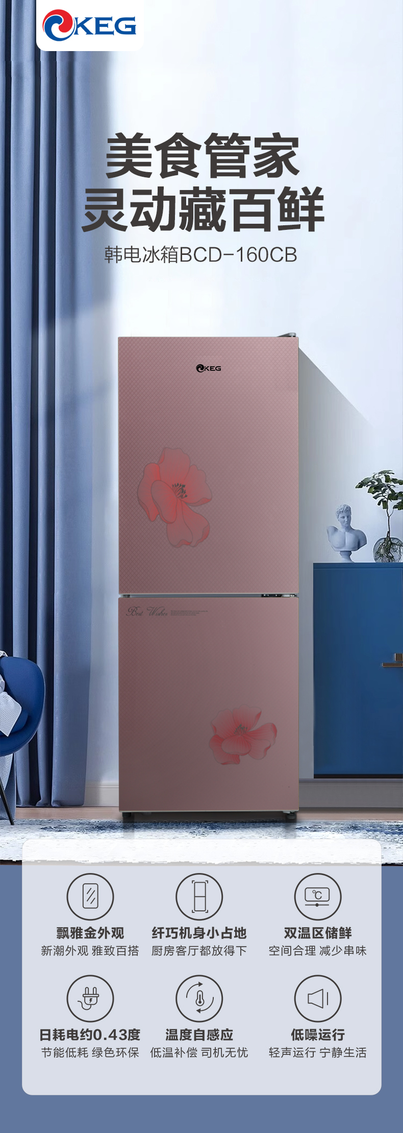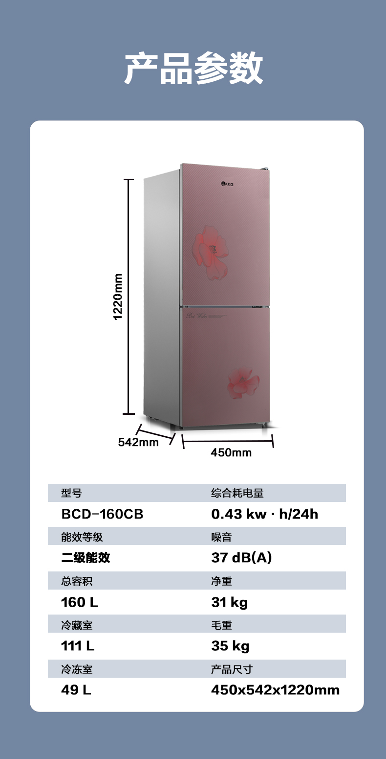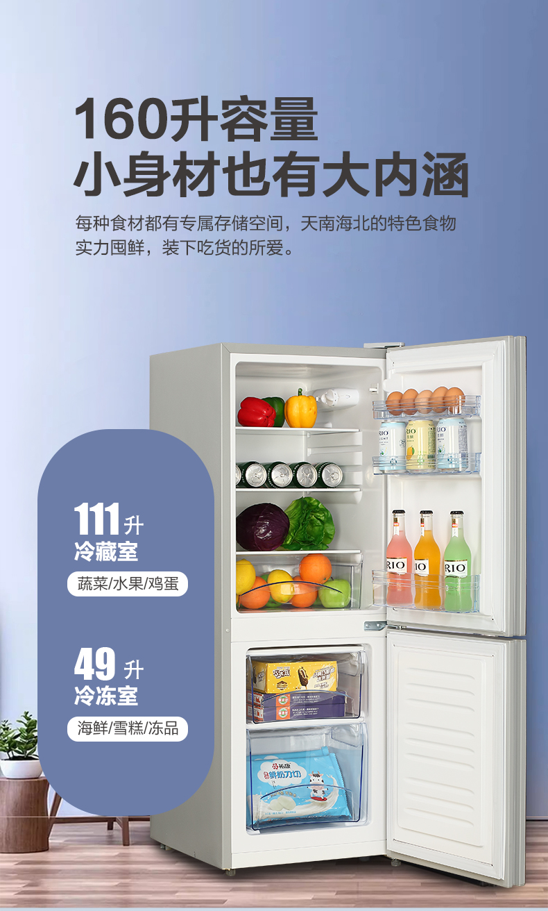 产品描述:这款160升双门冰箱。以其优雅的设计、卓越的性能和实用的功能,成为现代家庭的理想选择。