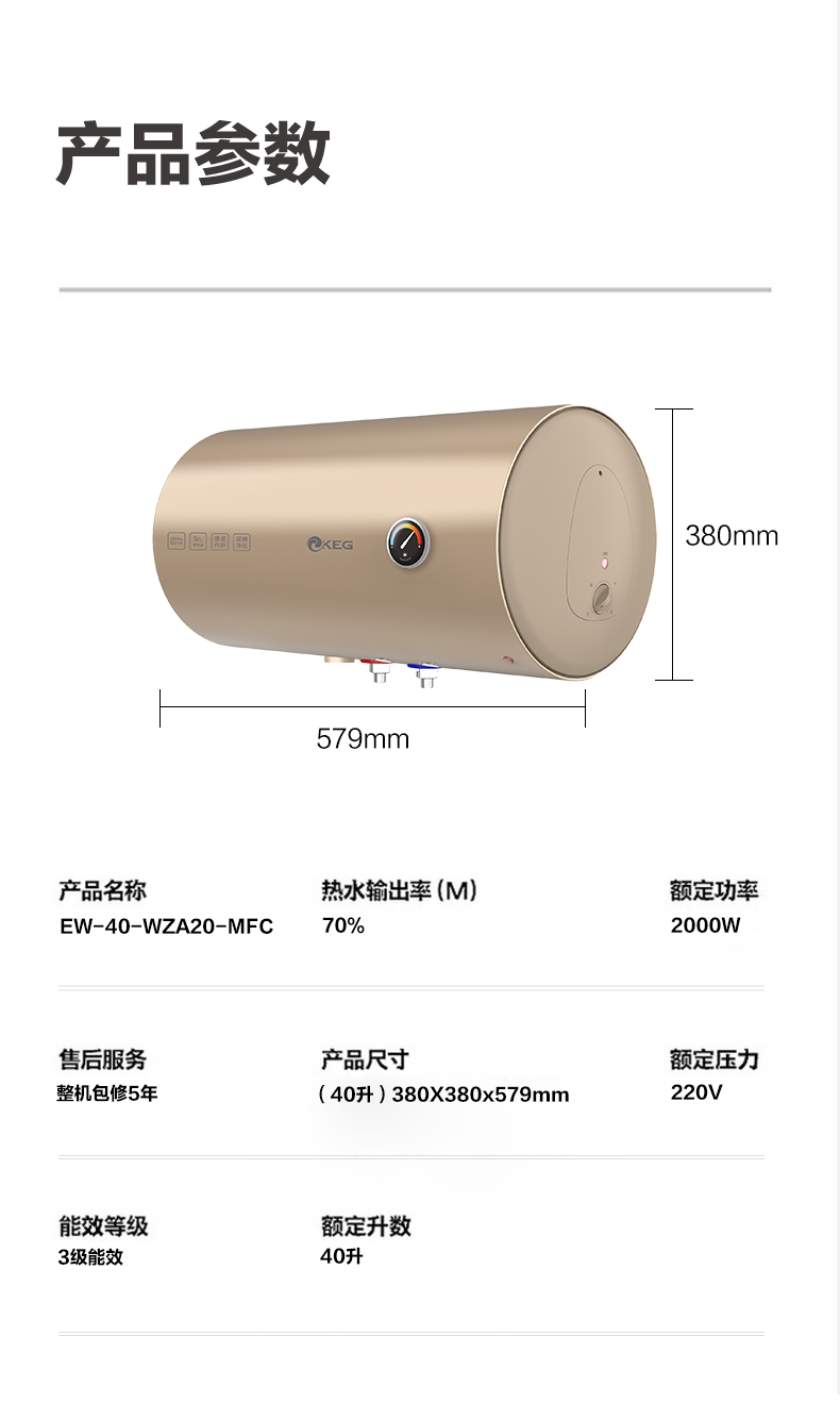 产品描述:韩电40升热水器拥有快速加热功能,让您无需漫长等待即可享受热水;精准控温技术,确保水温稳定舒适;大容量设计满足全家用水需求;高效节能,为您节省电费开支;安全防护系···