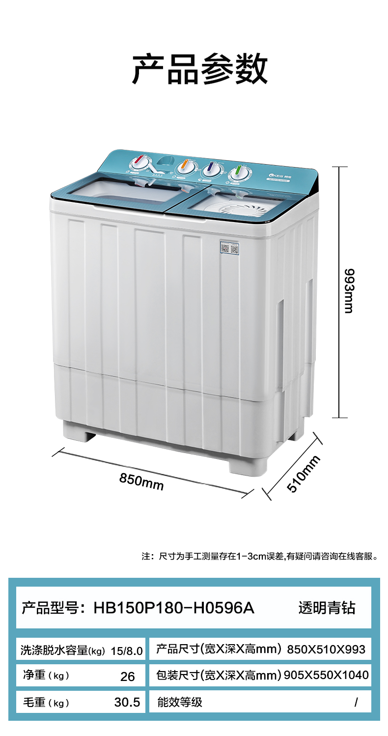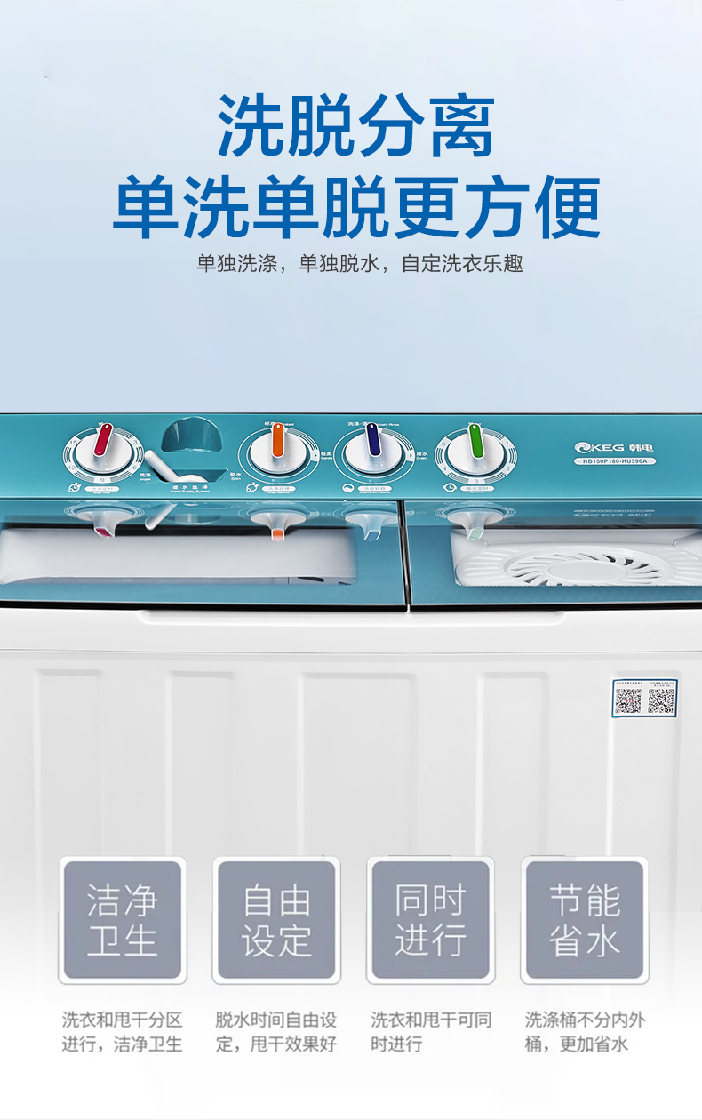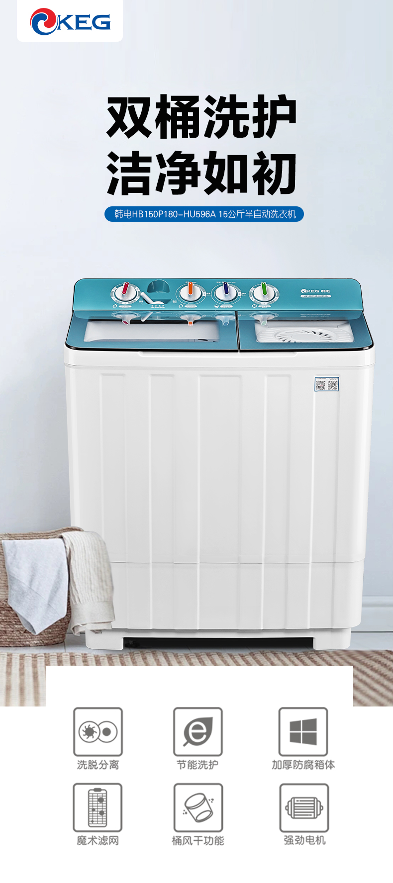 产品描述:韩电15公斤的双桶洗衣机,大容量优势尽显,双桶带来灵活分类洗涤功能,是家庭洗衣的得力助手,满足多样需求。