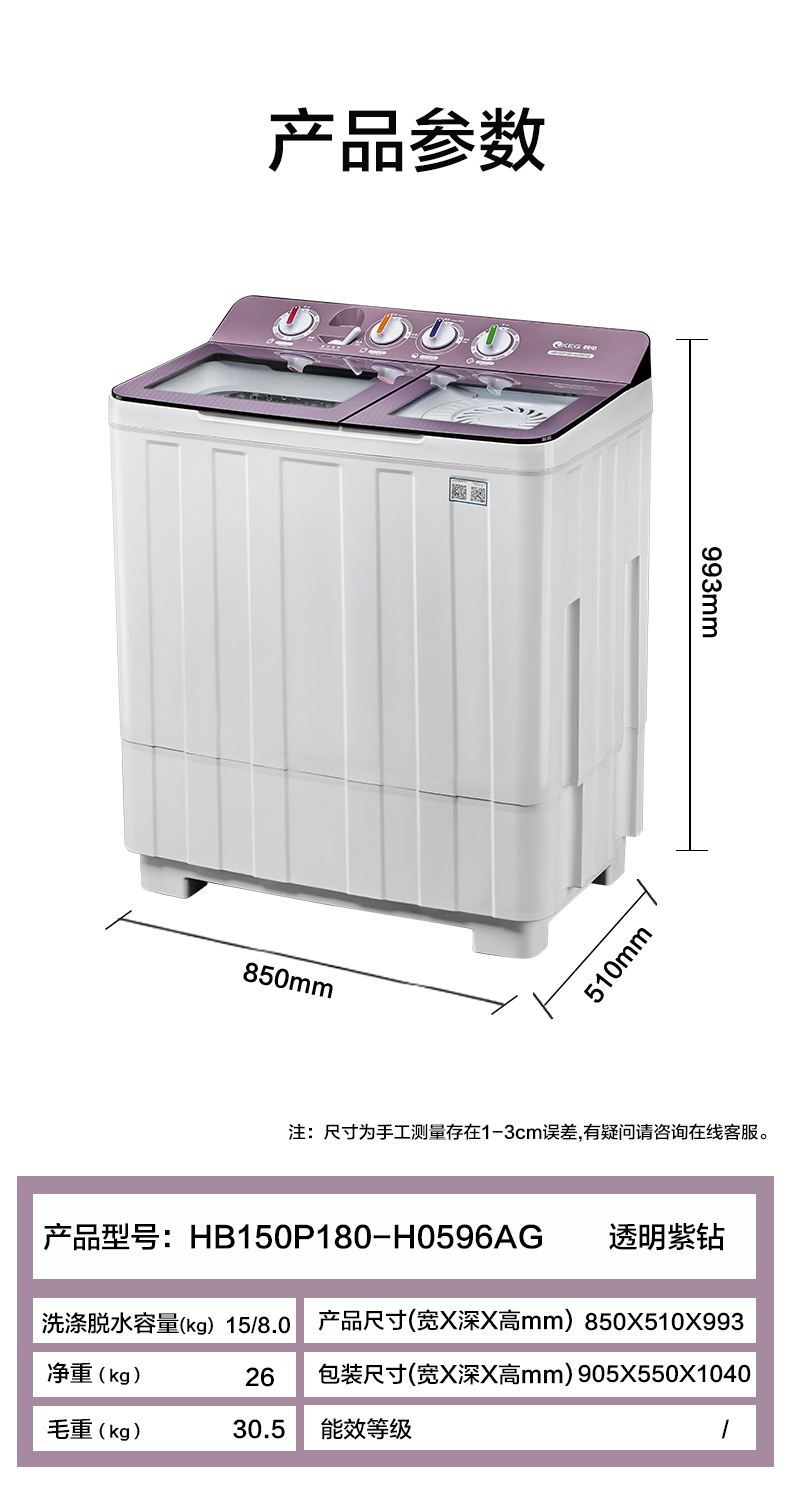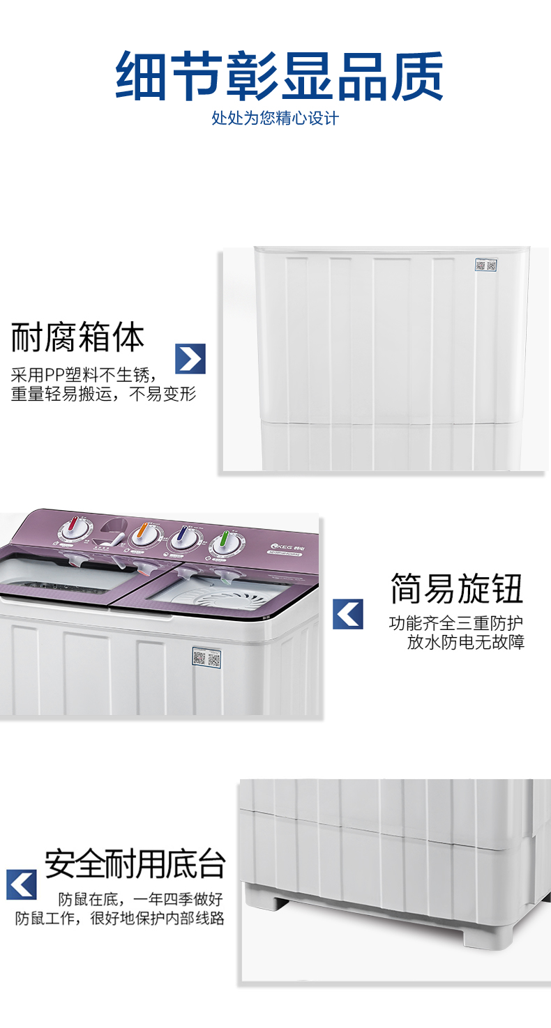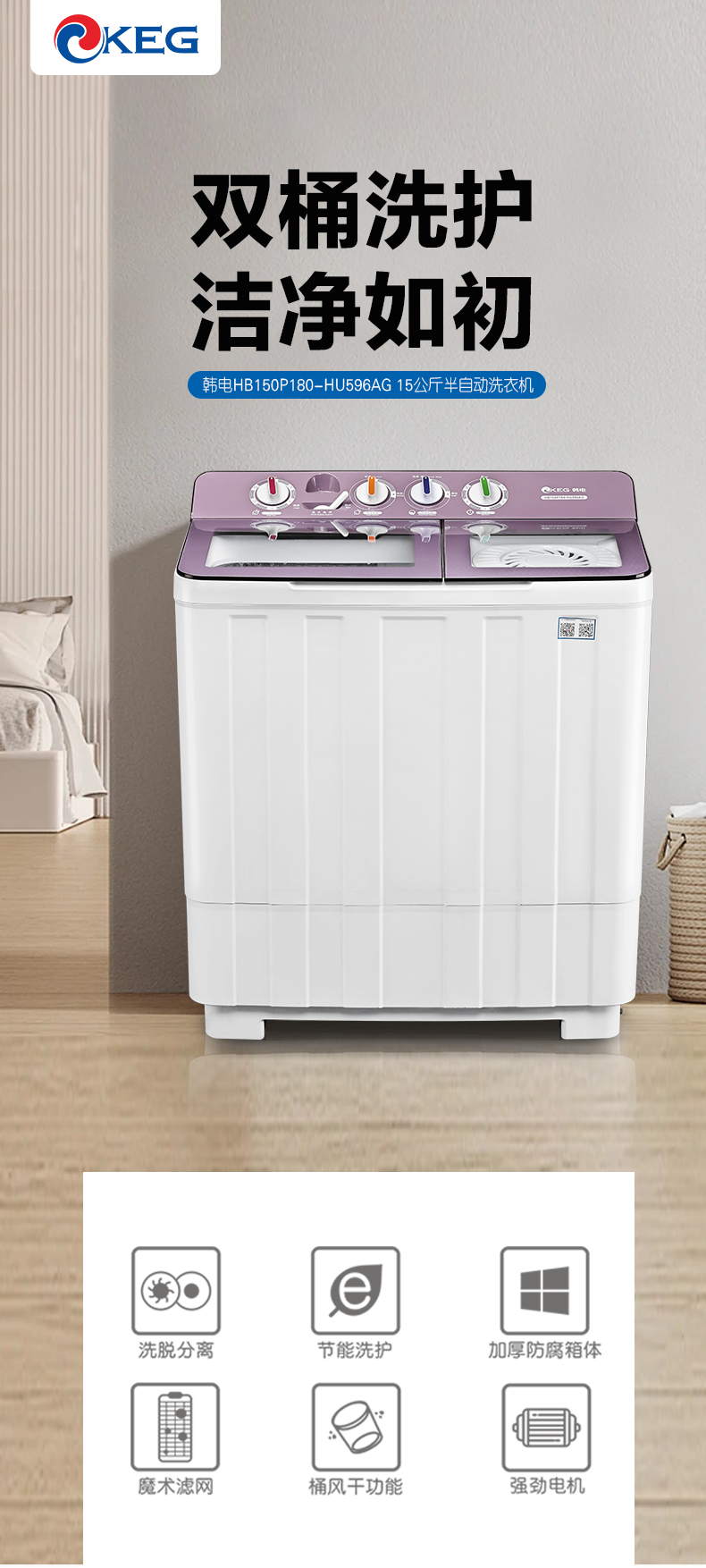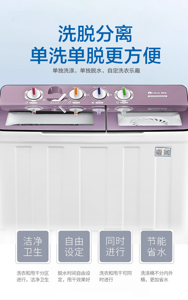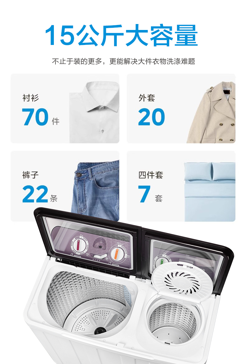 产品描述:韩电15公斤的双桶洗衣机,大容量优势尽显,双桶带来灵活分类洗涤功能,是家庭洗衣的得力助手,满足多样需求。