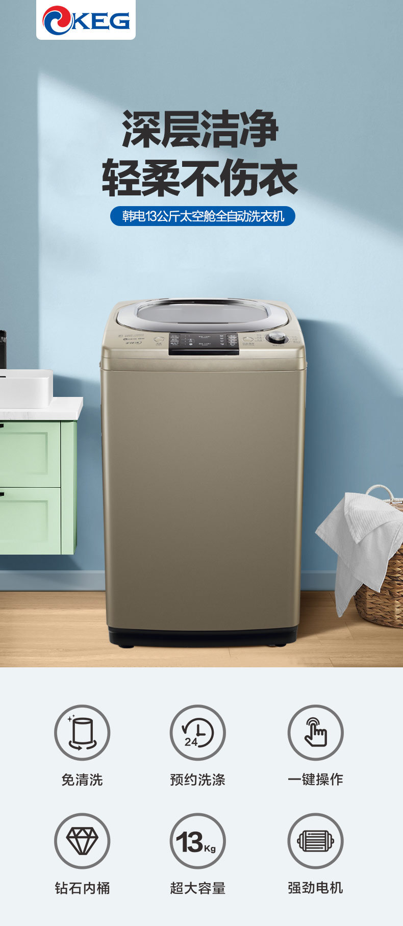 产品描述:韩电13公斤全自动太空舱洗衣机,拥有超大容量、智能洗涤、太空舱般精致外观与卓越性能,是家庭洗衣的得力助手,满足多样需求。