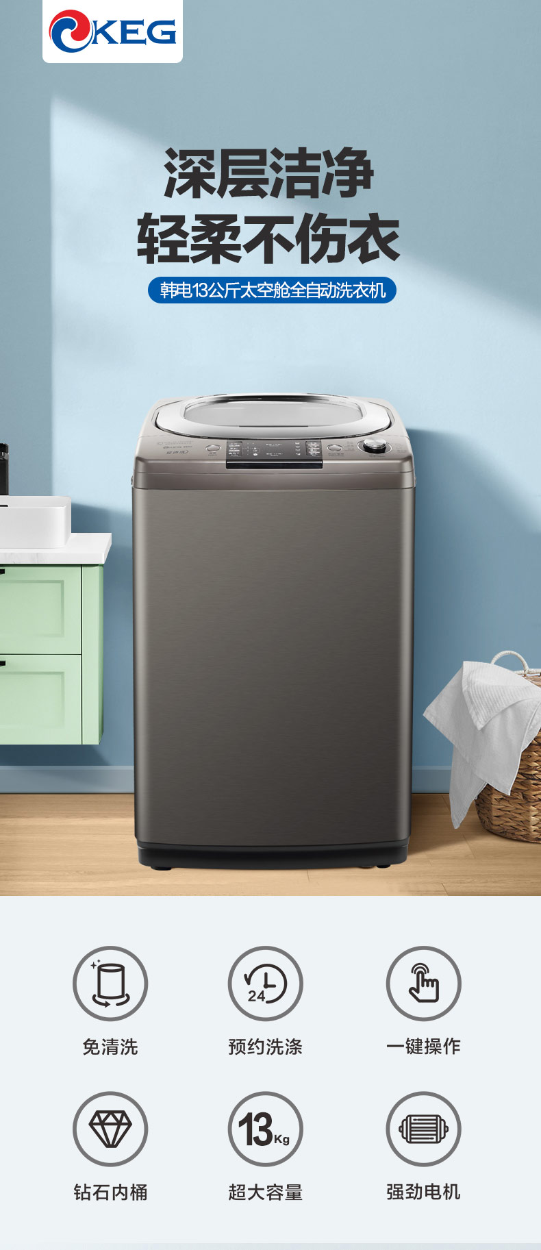 产品描述:韩电13公斤全自动太空舱洗衣机,拥有超大容量、智能洗涤、太空舱般精致外观与卓越性能,是家庭洗衣的得力助手,满足多样需求。
