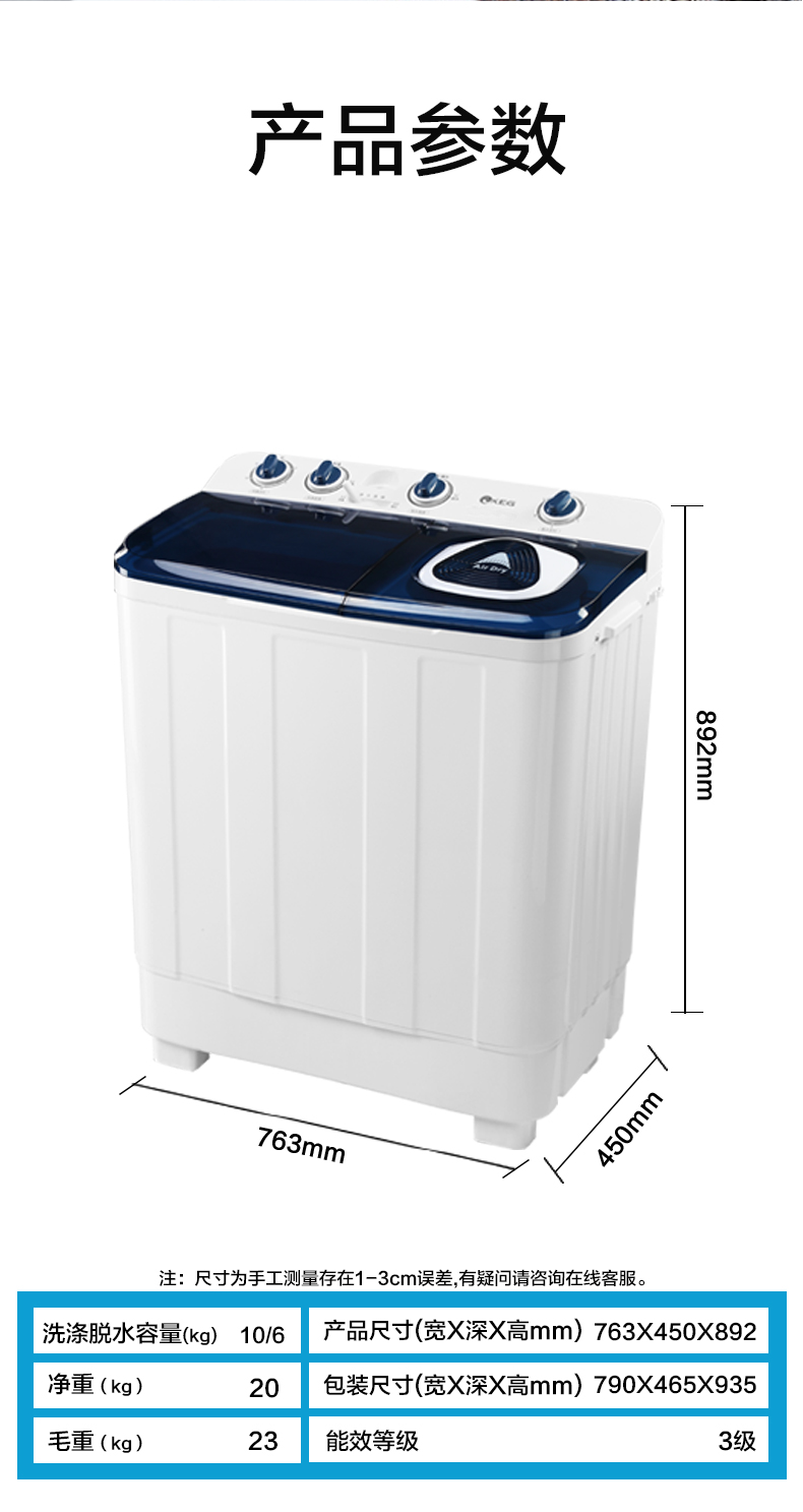 产品描述:韩电10公斤的双桶洗衣机,优势尽显,双桶带来灵活分类洗涤功能,是家庭洗衣的得力助手,满足多样需求。