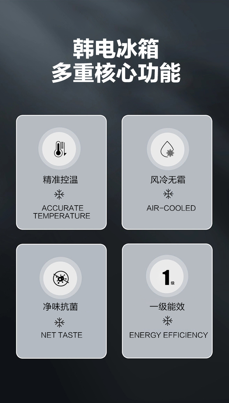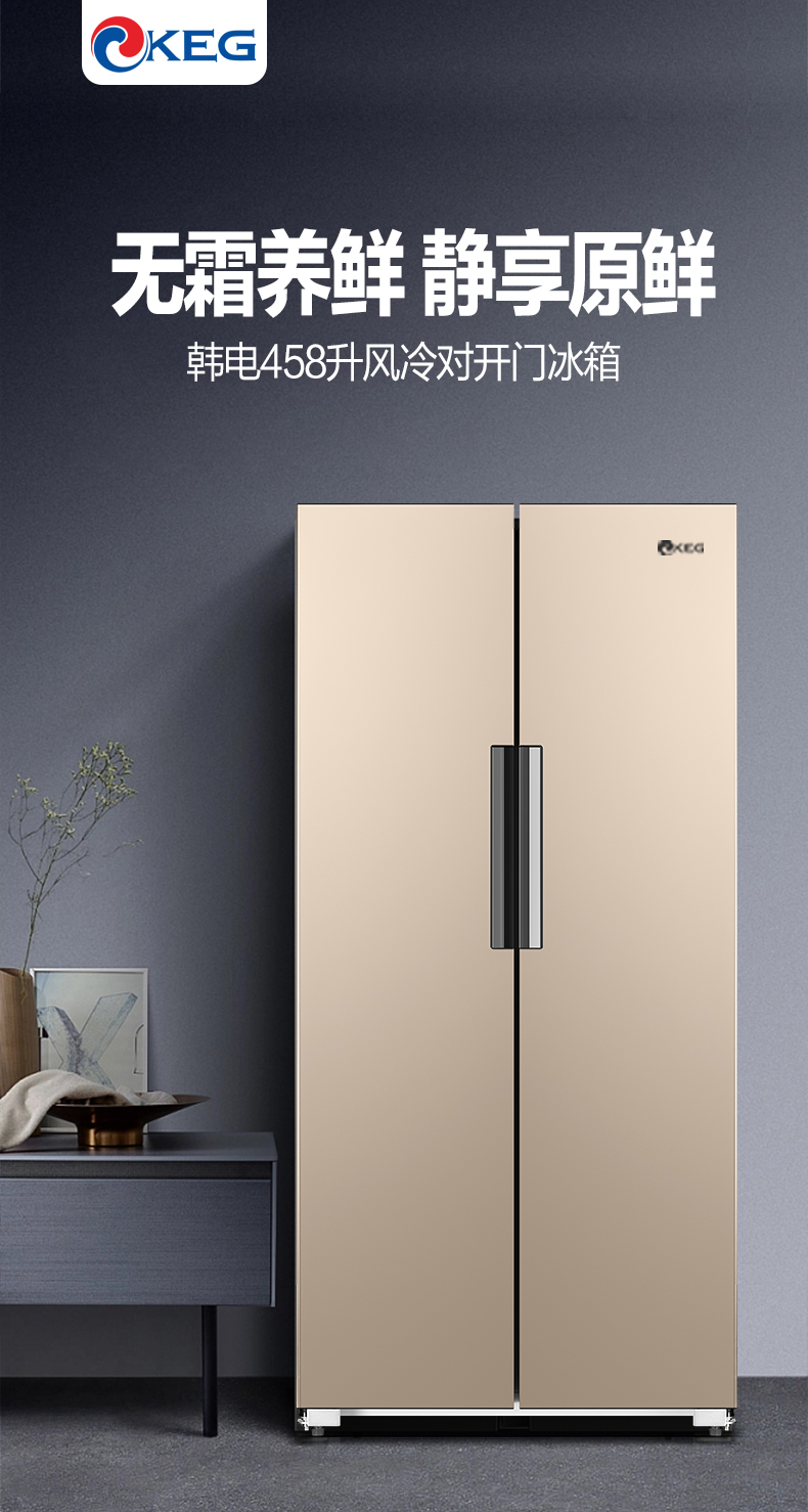 产品描述:韩电458升对开门字风冷冰箱凭借其双对开门设计、风冷无霜技术、大容量储存空间、节能环保、智能控制、静音运行以及时尚外观设计等卖点,成为了现代家庭理想的食品储存设备。···